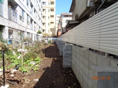 工事内容 | A・B棟既存隣地境界確認後、万年塀取壊し及びブロック塀・ルーバー新設 |